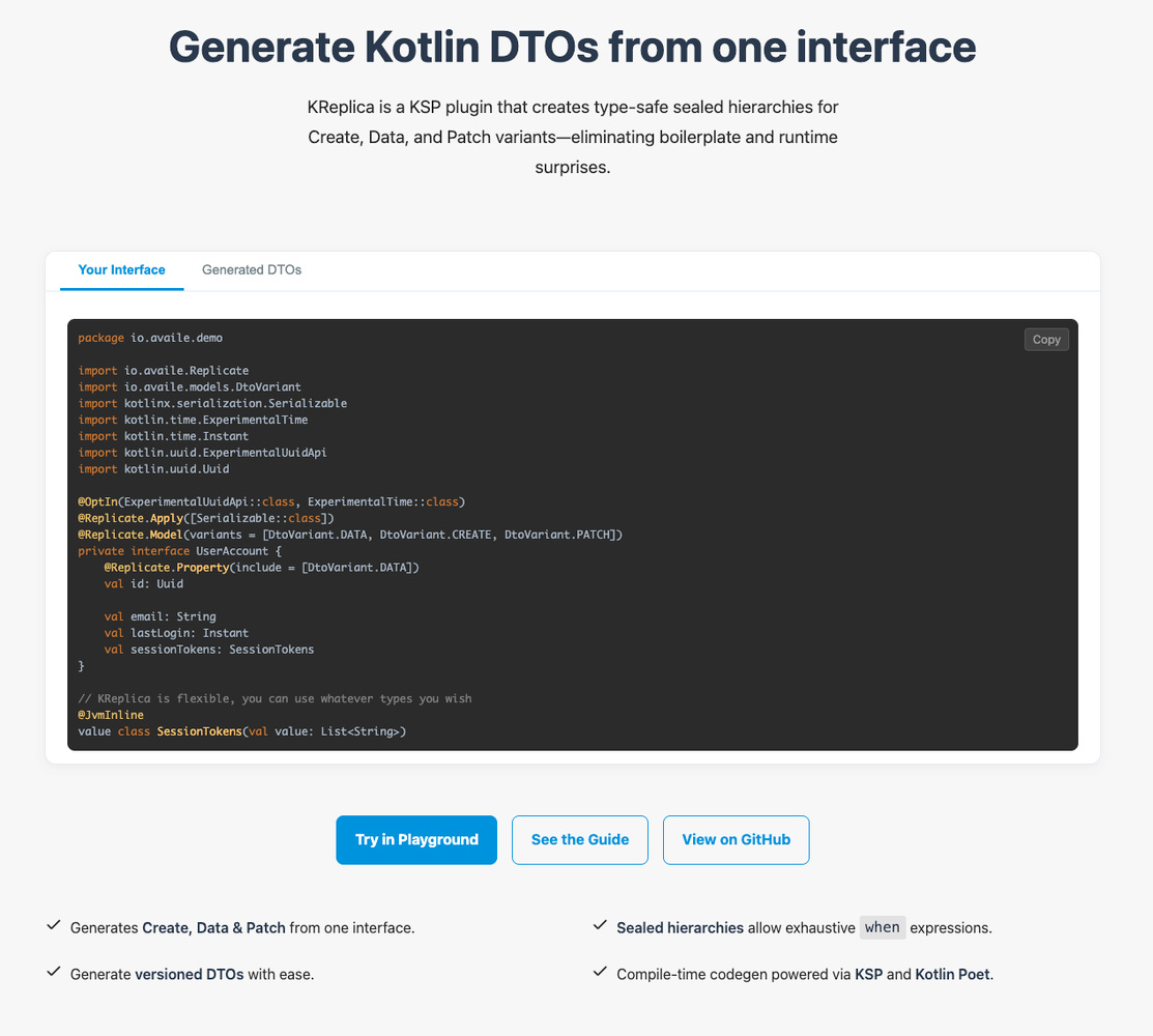 KReplica is a lightweight plugin based on Kotlin Symbol Processing (KSP), designed to eliminate boilerplate related to DTOs and mapping between application layers. You install it as a KSP processor, and during compilation it generates mapping code/adapters for your data classes—resulting in fewer hand-written converters, fewer errors, and faster iterations. More information and a demo can be found on the project page: kreplica.availe.io.