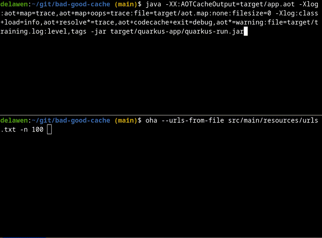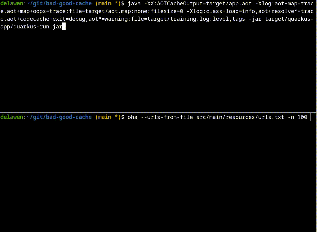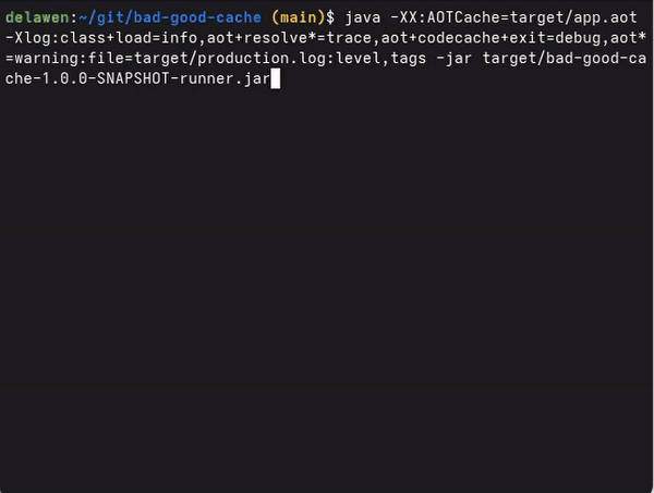 $ java -XX:AOTCacheOutput=target/app.aot -Xlog:aot+map=trace,aot+map+oops=trace:file=target/aot.map:none:filesize=0 -Xlog:class+load=info,aot+resolve*=trace,aot+codecache+exit=debug,aot*=warning:file=target/training.log:level,tags -jar target/quarkus-app/quarkus-run.jar