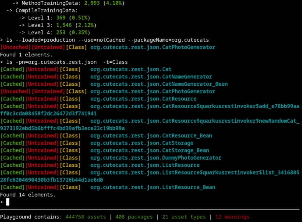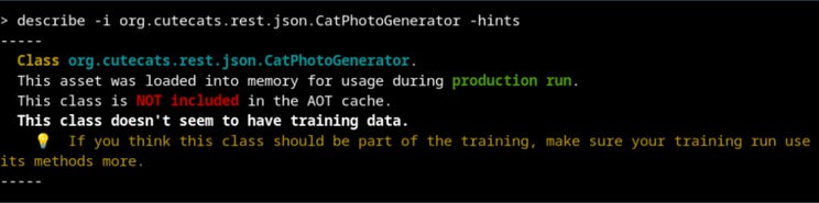 Depending on how well you train your deployment you may see different improvements in time to reach application start (startup time) and time to reach peak performance (warmup time). Log output is one useful way to measure these two metrics but the details will depend on what monitoring capabilities are available in your test or production environment. However, simply measuring these two times (or even recording warmup profiles) doesn’t help with the problem of explaining why, for some given training regime, you get a specific improvement or perhaps, in some cases, no measurable improvement.