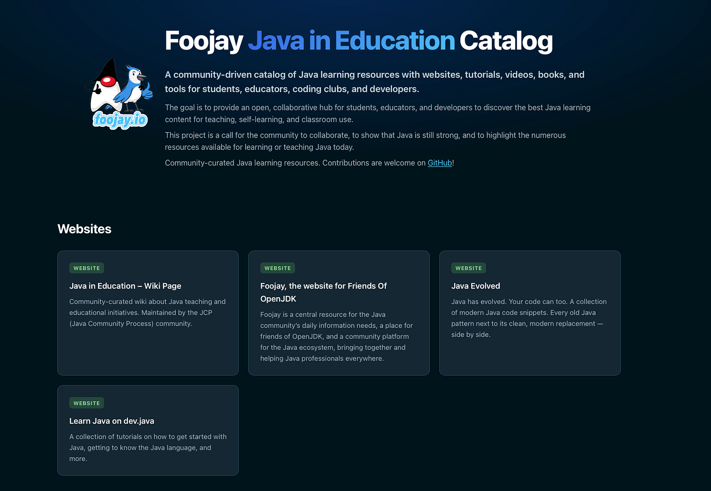 It now has a proper website at education.foojay.social, built using a workflow borrowed (with permission) from James Ward‘s excellent ai4jvm.com site. The catalog includes JetBrains tutorials, Devoxx4Kids resources, Pi4J/JBang examples for Raspberry Pi, and books like “Raising Young Coders.” Contributing is as simple as editing a SPEC.md file and opening a PR. A GitHub README is functional, but an actual browsable website is what gets educators - who aren’t necessarily deep in the coding ecosystem - to actually discover and use these resources.