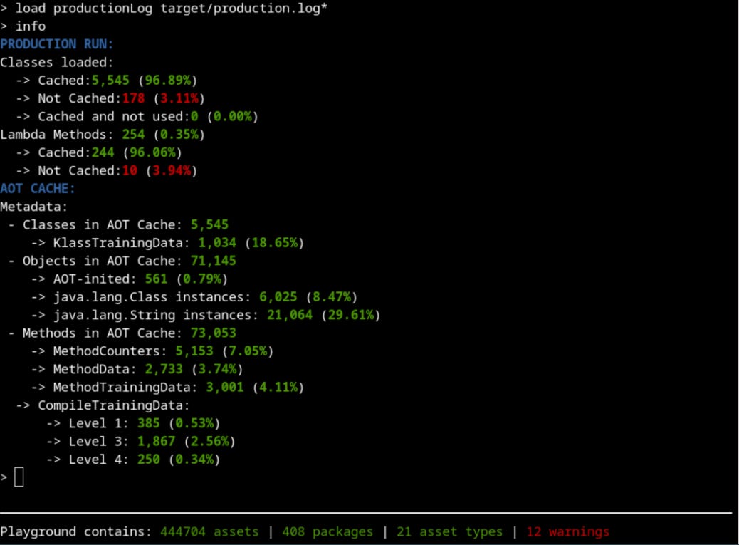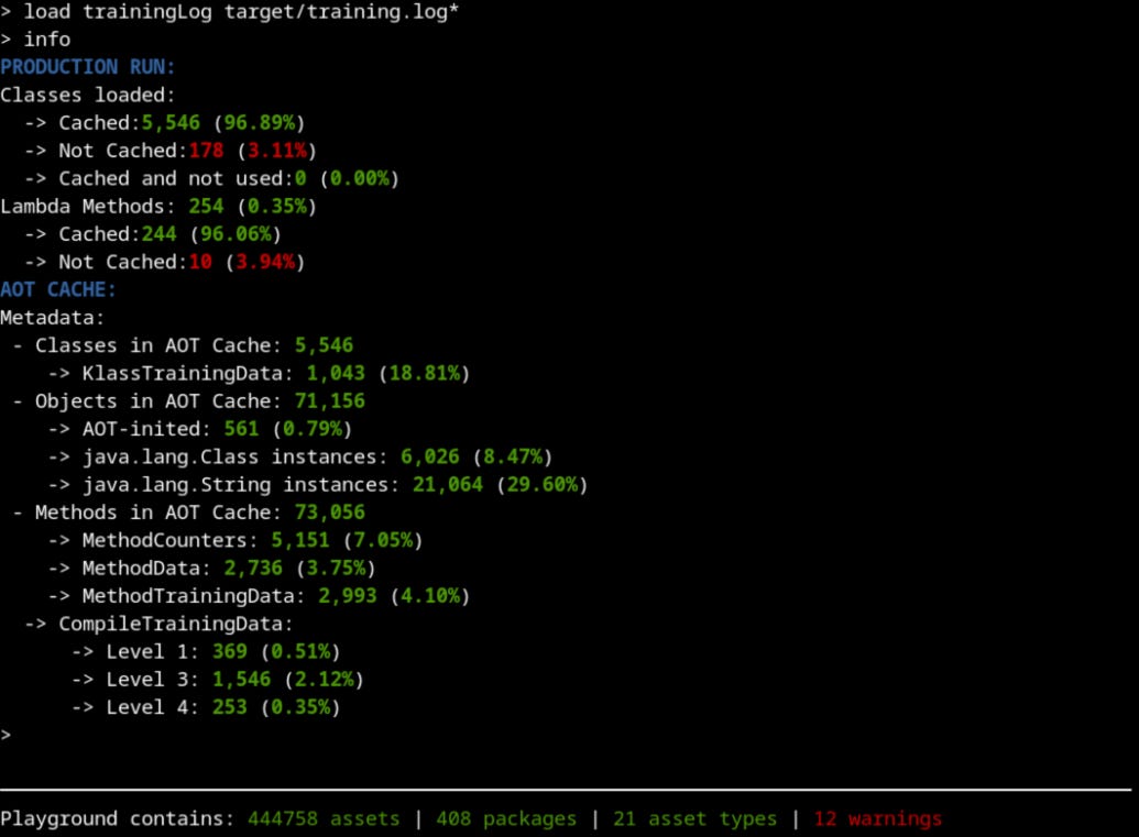 For any given AOT cache (or set of alternative caches) it is very helpful to have some idea of what assets were included or excluded in the training set, which ones were written into the cache and what benefit they provide during a production run. In particular, it is useful to have both aggregate statistics and information on individual assets and their relationships. The Leyden project has provided a tool precisely to address these needs. Let’s see a practical example of how to diagnose an AOT Cache.