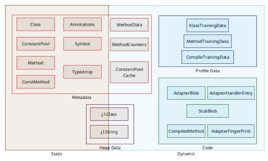 Metadata stored in the AOT cache is a superset of what was stored in a CDS archive. The subset which overlaps with CDS is the static metadata. The latter represents the structure and hierarchy of classes in JDK and application code. Primarily, it helps avoid the cost of parsing bytecode, as it is in the same format as the JVM’s own internal metadata model: classes, methods, fields, inheritance between classes,... which can be mapped directly into memory. Having this information stored in the cache speeds up the time the Hotspot takes to decode the different class files, and to build the dependency graph.