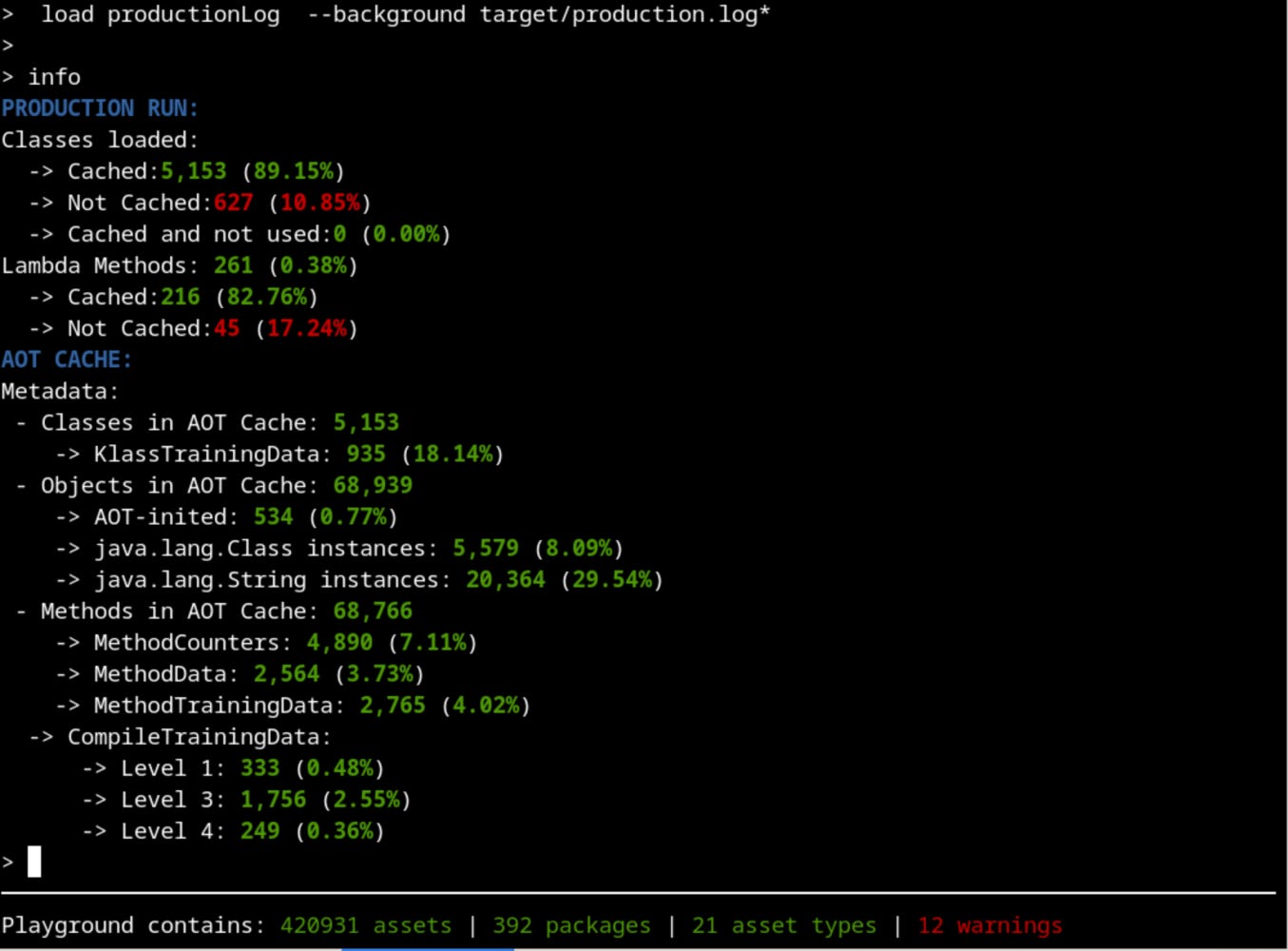 -Xlog:class+load=info,aot+resolve*=trace,aot+codecache+exit=debug,aot*= warning:file=target/production.log:level,tags Which will generate a production log file with relevant information