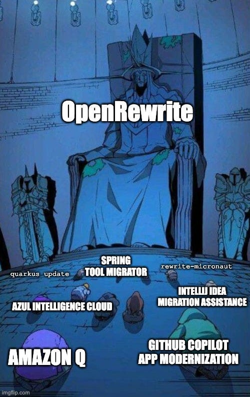 Another increasingly popular use case is migrating large amounts of code. In Java’s world of automated modernization, the discussion almost has to start with OpenRewrite by Moderne . This open-source heavyweight, powered by precise “recipes” and operating directly on the AST, has become the de facto industry standard. Its strength lies in surgical precision and a vast community-driven library of transforms - covering everything from JDK upgrades to patching critical vulnerabilities across entire portfolios. It’s the foundation of modern refactoring - but the arena is getting crowded as major players enter with powerful solutions.