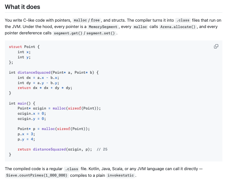 What sells it for me is that it’s a complete loop: source goes in, real .class files come out, and Kotlin/Java/Scala can call them via plain invokestatic - Sieve.countPrimes(1_000_000) compiles to a regular static method call. The arena modifiers (confined, shared, global, auto) are a particularly nice touch - you control memory lifetime per function, and the arena gets closed (freeing all mallocs in one go) when the function returns. It’s a great teaching artifact for anyone who wanted to understand how Panama, ANTLR, and ASM actually fit together.