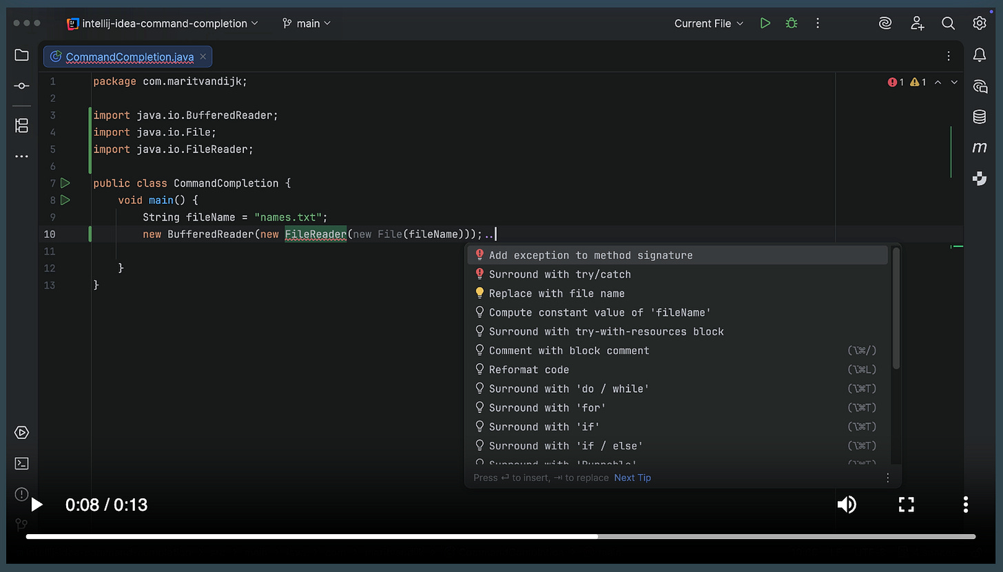 The new command completion feature in IntelliJ IDEA (..) lets you discover and execute IDE actions right from your editor - no shortcut memorization required. Type two dots after any symbol, and you’ll see all relevant commands for your current context. Want to rename a class but forgot Shift+F6? Just type .. and filter for rename. Need to add JavaDoc? you know the drill - ..add javadoc. Some commands even have aliases, so ..change name works just as well.