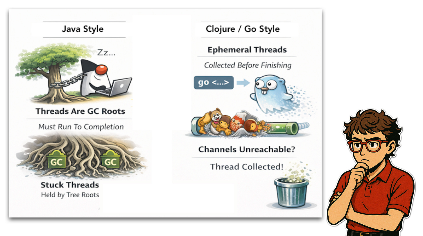 The topic? So-called “ephemeral threads”- threads that can be garbage collected before they finish their work. Sounds like heresy in the Java world, where for 30 years an iron rule has applied: threads are GC roots and live until they complete their work. But for the Clojure community, this has been daily bread for over a decade.