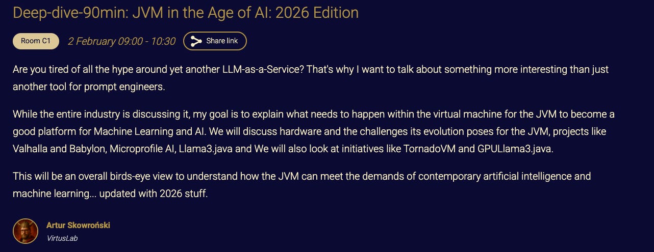 I’ll be running a 90-minute Deep Dive session focused on what really needs to happen inside the JVM for it to remain a serious platform for AI and ML - hardware, Valhalla, Babylon, GPU offloading, TornadoVM, Llama3.java, and the 2026 perspective.